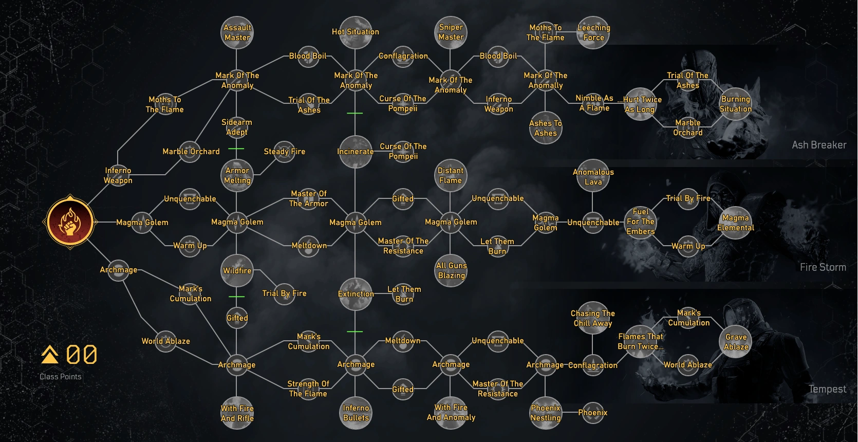 The Pyromancer can use Class Points to choose along three different class trees, starting at level 5.